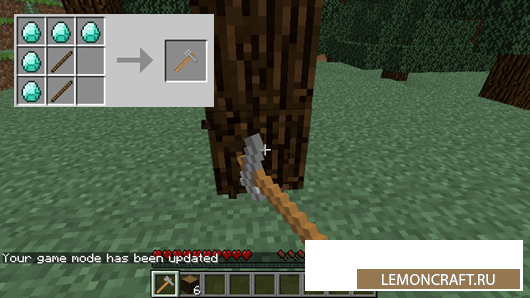 Мод Whole Tree Axe добавляет в игру супер топор, который рубит всю древесину, находящуюся в одном месте. Но есть небольшая проблема. Данный топор рассчитан всего на 59 ударов. После того как вы нанесете 59 ударов по древесине, топор сломается. Ничего страшного ), скрафтите новый.